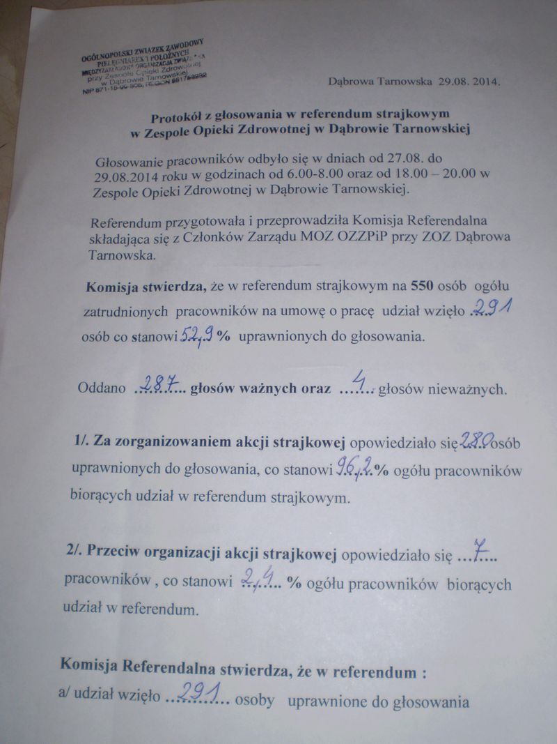 I trochę matematyki: by referendum w szpitalu było ważne, musi wziąć w nim udział połowa plus jeden, z ogółu pracowników zatrudnionych na etatach, czyli z 550. wszystkich uprawnionych do głosowania, zagłosować musi 276. W referendum wzięło udział 291 osób (co stanowi 52, 9 % ogółu uprawnionych), czyli o 15 więcej, niż było to konieczne do ogłoszenia ważności głosowania. Za strajkiem opowiedziało się 280 osób (96, 2%). By go przeprowadzić, zgodnie z prawem, podobnie jak w przypadku referendum, musi poprzeć go połowa z głosujących plus 1 pracownik, czyli ponad 146 osób (146, 5). Za strajkiem opowiedziało się prawie dwa razy tyle pracowników, ile było wymagane do podjęcia takiej decyzji (dokładnie – o 134 osoby więcej). Swój sprzeciw wyraziło… 7. pracowników (2, 4%). Głosy nieważne oddały 4 osoby (na 287 ważnych głosów).