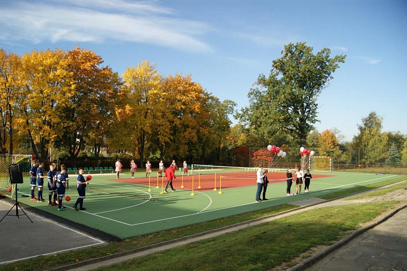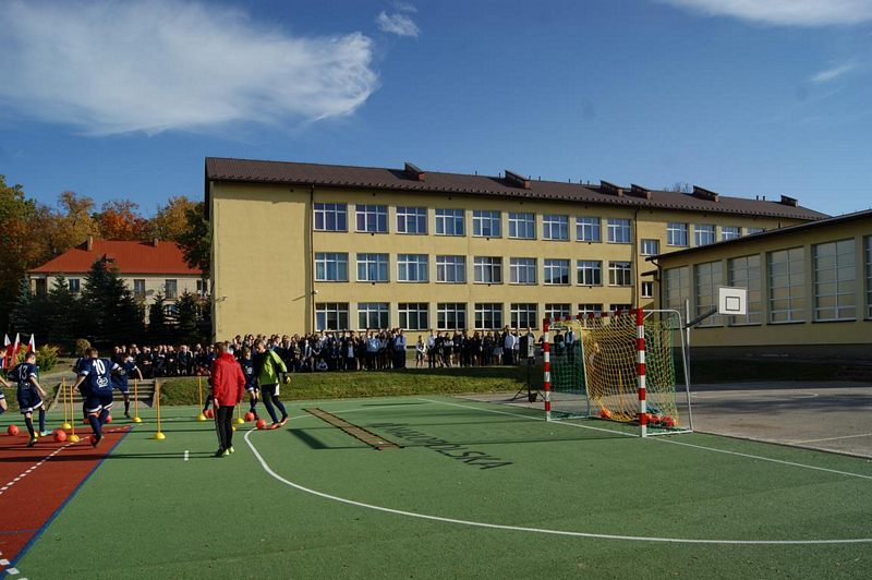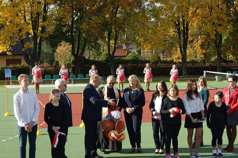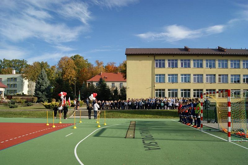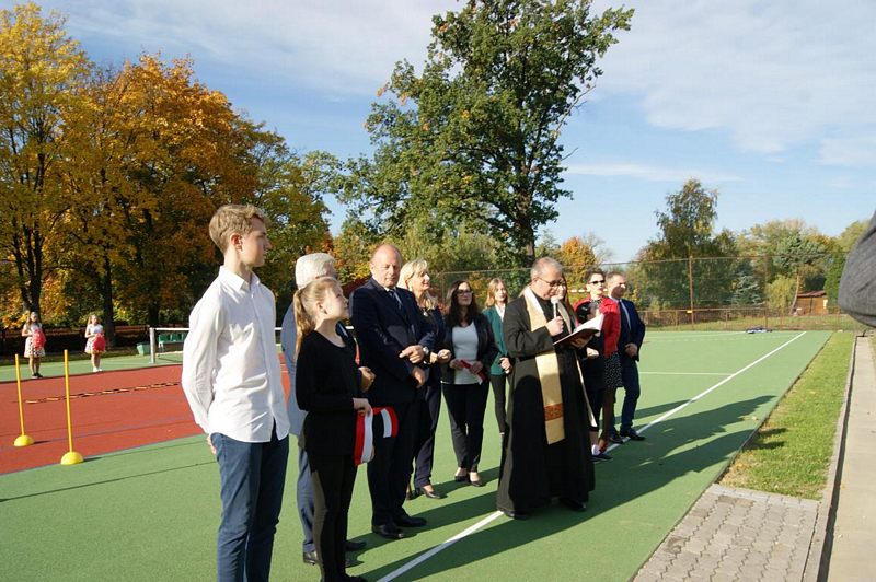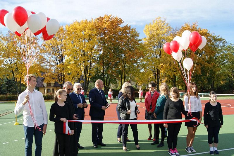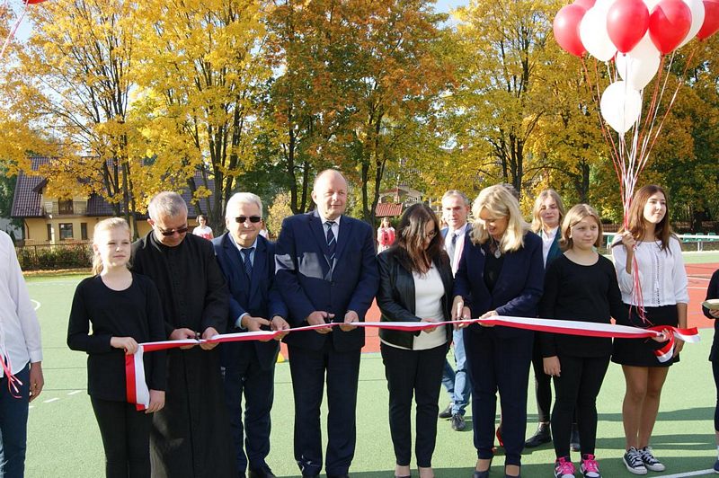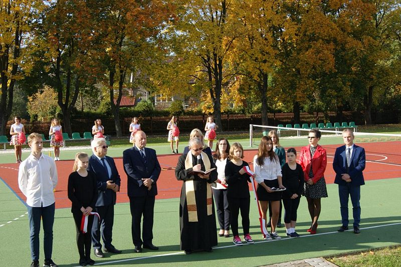 Na uroczystości Gości powitała dyrektor szkoły Iwona Wrzoskiewicz–Słonka. W swoim przemówieniu zwróciła uwagę m.in. na ważność sportu w kształtowaniu charakterów i postaw wśród młodych ludzi. Podobne kwestie w swoich wystąpieniach podnosili burmistrz Krzysztof Kaczmarski i wicemarszałek Stanisław Sorys. Następnym punktem było tradycyjne przecięcie wstęgi przez zaproszone osoby oraz poświęcenie boiska, czego dokonał ksiądz proboszcz Stanisław Cyran.