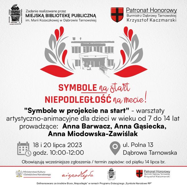 Miejska Biblioteka Publiczna w Dąbrowie Tarnowskiej zaprasza dzieci w wieku od 7 do 14 lat na lipcowe warsztaty w ramach realizacji zadania „Symbole na start – Niepodległość na mecie!”.