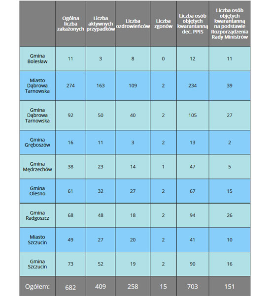 Łącznie liczba potwierdzonych przypadków zakażenia koronawirusem w powiecie wynosi 682 osoby (w tym 75 w ostatniej dobie). Z ogólnej liczby osób zakażonych status ozdrowieńca do tej pory uzyskało 258 osób (w tym 5 w ostatniej dobie). Liczba zgonów spowodowanych COVID-19 wynosi 15.
