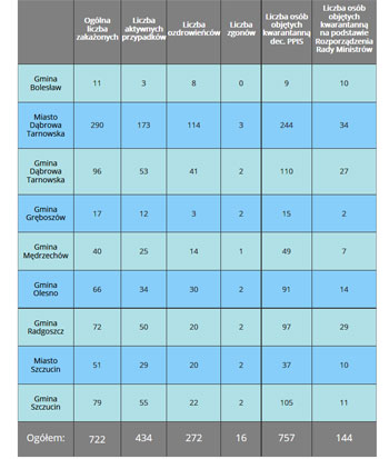 Łącznie liczba potwierdzonych przypadków zakażenia koronawirusem w powiecie wynosi 722 osoby (w tym 40 w ostatniej dobie). Z ogólnej liczby osób zakażonych status ozdrowieńca do tej pory uzyskało 272 osób (w tym 14 w ostatniej dobie). Liczba zgonów spowodowanych COVID-19 wynosi 16.