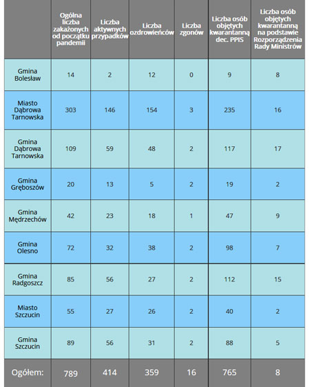 Łącznie liczba potwierdzonych przypadków zakażenia koronawirusem w powiecie wynosi 789 osób (w tym 8 w ostatniej dobie). Z ogólnej liczby osób zakażonych status ozdrowieńca do tej pory uzyskało 359 osób (w tym 27 w ostatniej dobie). Liczba zgonów spowodowanych COVID-19 wynosi 16.