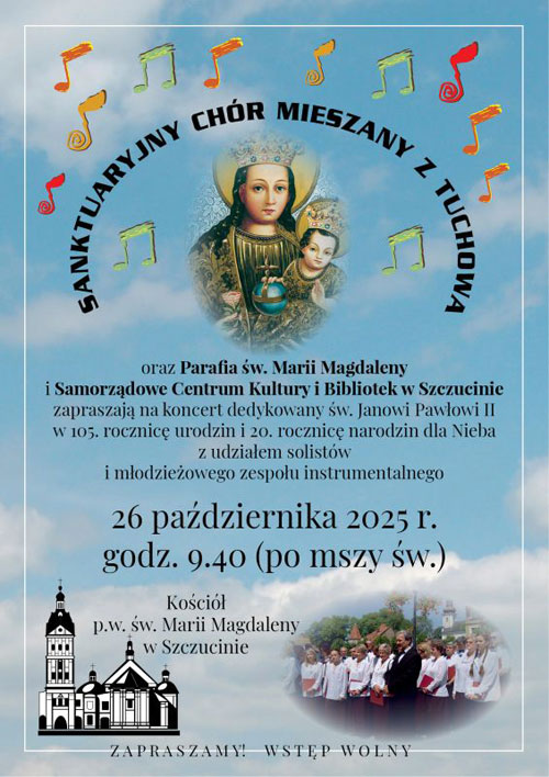 Parafia św. Marii Magdaleny oraz Samorządowe Centrum Kultury i Bibliotek w Szczucinie zapraszają wszystkich mieszkańców oraz gości na wyjątkowy koncert dedykowany św. Janowi Pawłowi II, organizowany z okazji 105. rocznicy jego urodzin oraz 20. rocznicy jego narodzin dla Nieba.