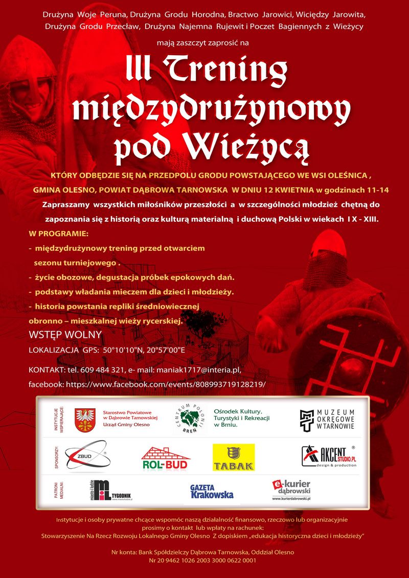 Planujemy kolejne imprezy plenerowe – być może już w maju warsztaty łucznicze dla dzieci i młodzieży zakończone mini-turniejem. Mamy też nadzieję na liczny przyjazd zbrojnych na turniej rycerski we wrześniu, który po raz pierwszy odbędzie się na dużym, nowo nabytym przez Poczet Bagiennych z Wieżycy terenie. Impreza odbyła się dzięki wsparciu Urzędu Gminy Olesno, prywatnych sponsorów – firmy ZBUD, ROLBUD, TABAK oraz piekarni OLEŚ. Kolejny raz plakat imprezy wykonało nieodpłatnie Firma Reklamowa AKCENT STUDIO. Organizacyjnie wsparło nas też Starostwo Powiatowe w Dąbrowie Tarnowskiej, Centrum Polonii – Ośrodek Kultury, Turystyki i Rekreacji w Brniu i sołtyska wsi Oleśnica. Patronat naukowy sprawowało tradycyjnie Muzeum Okręgowe w Tarnowie a patronat medialny Gazeta Krakowska, e-Kurier Dąbrowski i MiL . Informacje o naszej imprezie podało też Radio Eska i Radio Kraków.