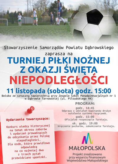 Serdecznie zapraszamy wszystkich mieszkańców powiatu dąbrowskiego do wspólnego kibicowania drużynom biorącym udział w Turnieju Piłki Nożnej z okazji Święta Niepodległości.