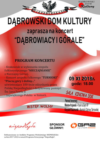 Koncert „Dąbrowiacy i górale”, nawiązujący w nazwie do słynnego dramatu Wojciecha Bogusławskiego („Krakowiacy i górale”), twórcy narodowej sceny, rozpocznie się od Krakowiaka w wykonaniu zespołu folklorystycznego „Nieczajnianie” z Nieczajny Górnej, najbardziej utytułowanego w regionie (pod kier. choreografa Jowity Wilowski). Następnie z repertuarem folkowym i w dużej części tematycznie poświęconym sylwetce św. Jana Pawła II („Płaczą góry i doliny”) radośnie celebrować będą Święto Niepodległości „Turnioki”.