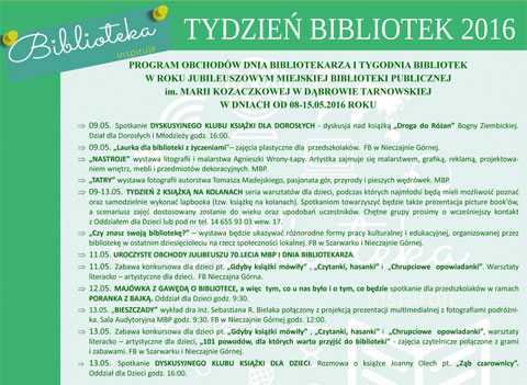 Program obchodów Dnia Bibliotekarza i Tygodnia Bibliotek w Miejskiej Bibliotece Publicznej im.Marii Kozaczkowej w Dąbrowie Tarnowskiej w dniach 08.05-15.05. 2016 r.