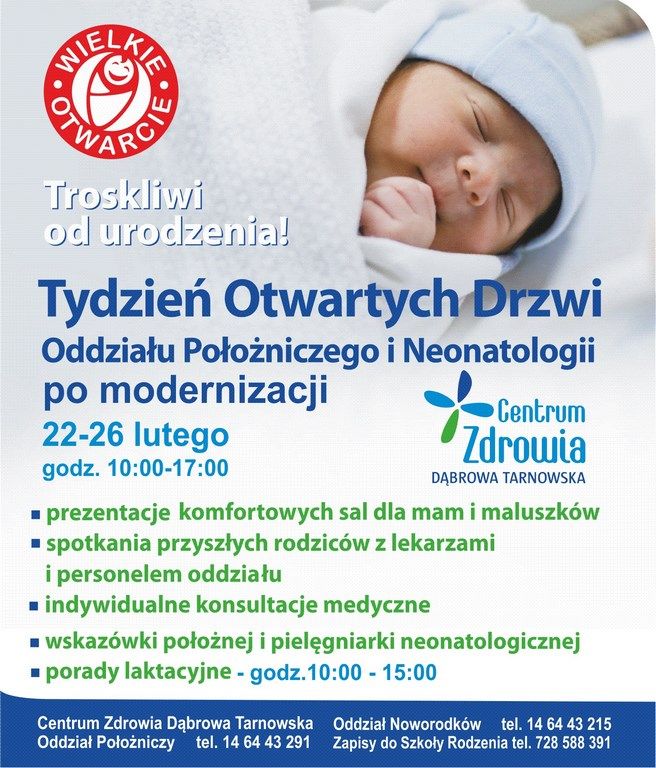 Ważna informacja dla przyszłych rodziców nie tylko z terenu Powiśla. Osoby spodziewające się dziecka lub planujące powiększenie rodziny w dniach od 22 do 26 lutego mogą odwiedzać zmodernizowane Oddziały Położniczy i Neonatologii Centrum Zdrowia Dąbrowa Tarnowska.