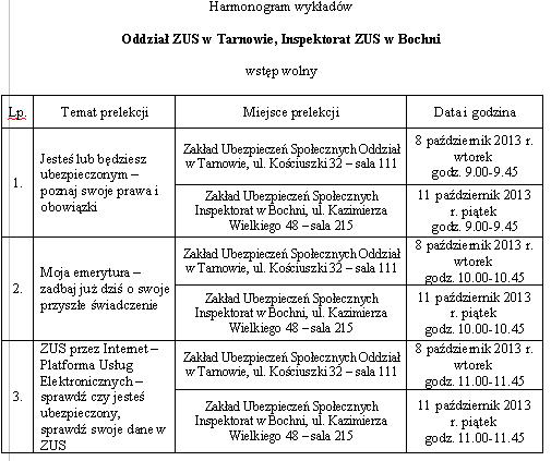 W trakcie trwania kampanii specjaliści z Oddziału ZUS w Tarnowie oraz Inspektoratu w Bochni będą udzielać indywidualnych porad i informacji z zakresu ubezpieczeń społecznych oraz rejestrować profile ubezpieczonych na PUE w poniedziałek w godzinach 8.00 – 17.00 natomiast od wtorku do piątku w godzinach 8.00 – 15.00. Poszerzyć wiedzę będzie można także na specjalnie przygotowanych i otwartych dla wszystkich wykładach, których zakres tematyczny podajemy w poniższym harmonogramie. Przydatne informacje można będzie znaleźć również w broszurach przygotowanych z myślą o odwiedzających „Dni Ubezpieczonego”.