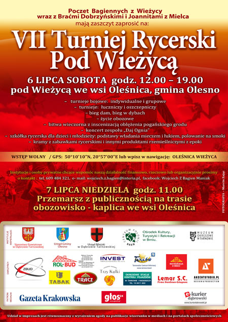 Już w sobotę, 6 lipca, odbędzie się VII Turniej Rycerski pod Wieżycą we wsi Oleśnica. Organizatorzy – Poczet Bagiennych z Wieżycy, Bracia Dobrzyńscy i Joannici z Mielca – serdecznie zapraszają wszystkich.