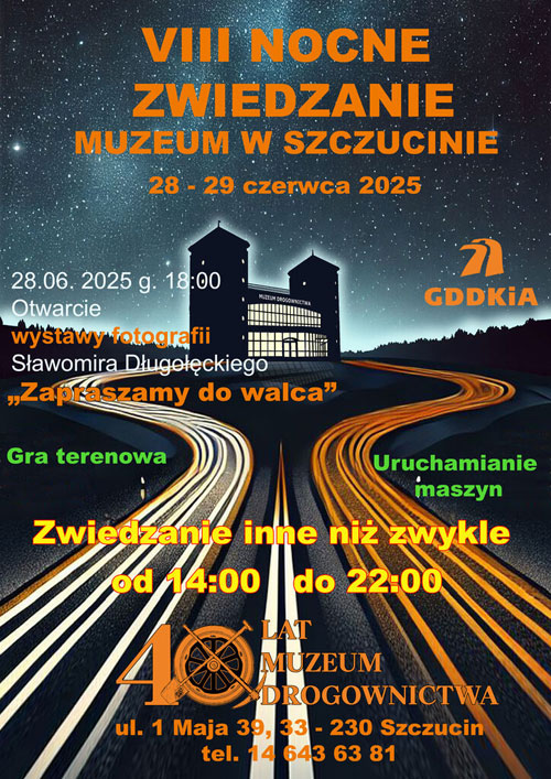 GDDKiA Zespół Historii Drogownictwa zaprasza na kolejne, VIII Nocne Zwiedzanie Muzeum Drogownictwa w Szczucinie.