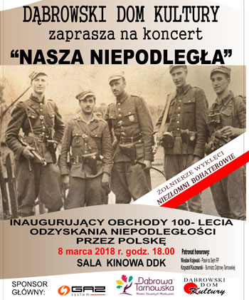 Dąbrowa Tarnowska inauguruje uroczyste obchody wielkiego jubileuszu 100-lecia odzyskania przez Polskę niepodległości, oddając też hołd Żołnierzom Wyklętym – w czwartek 8 marca o godz.18:00 w sali Kina „Sokół” odbędzie się koncert „NASZA NIEPODLEGŁA” (wstęp wolny).