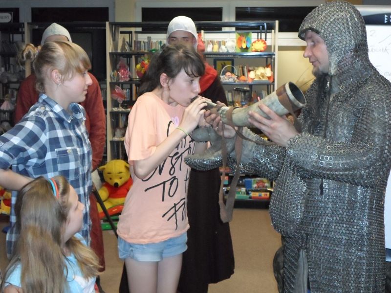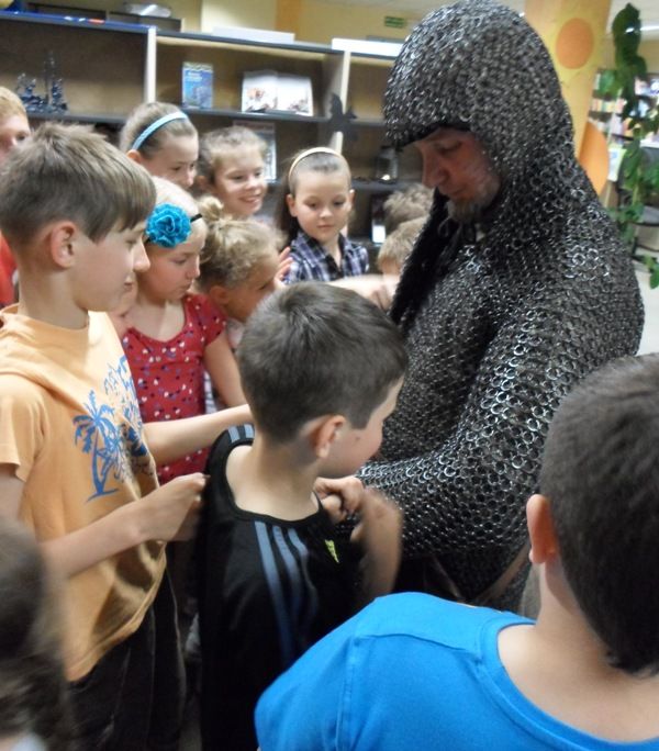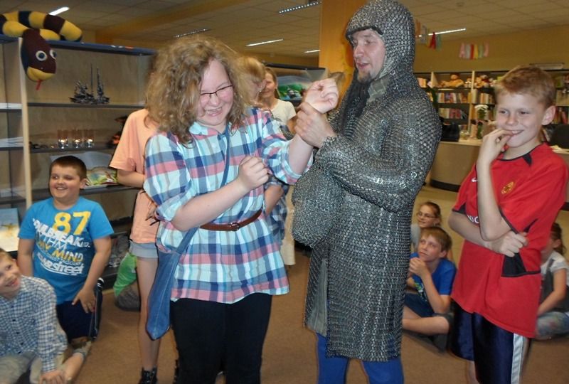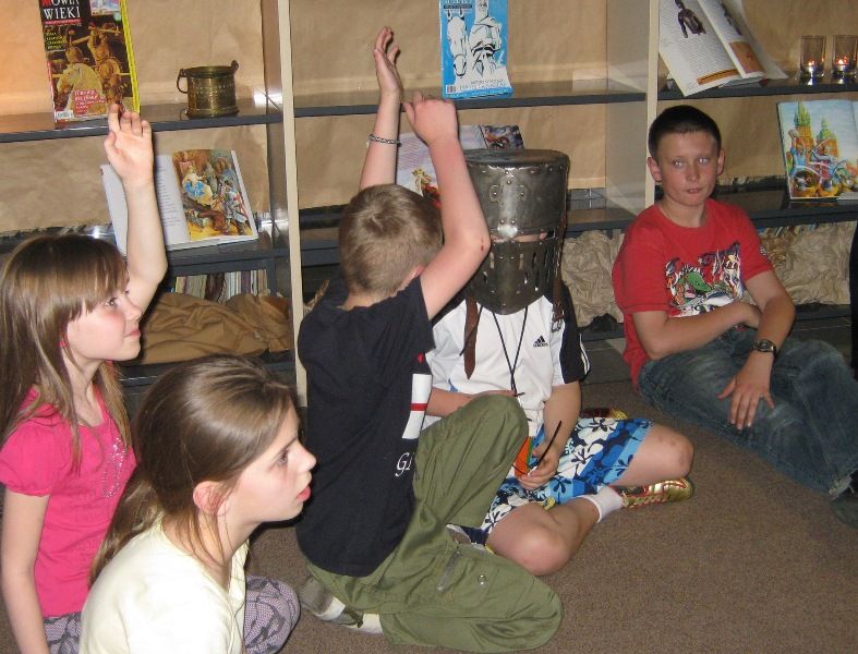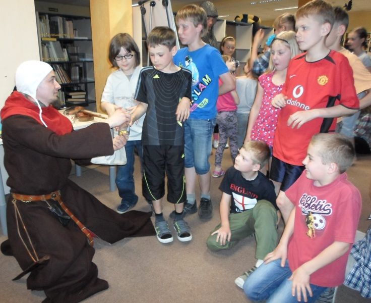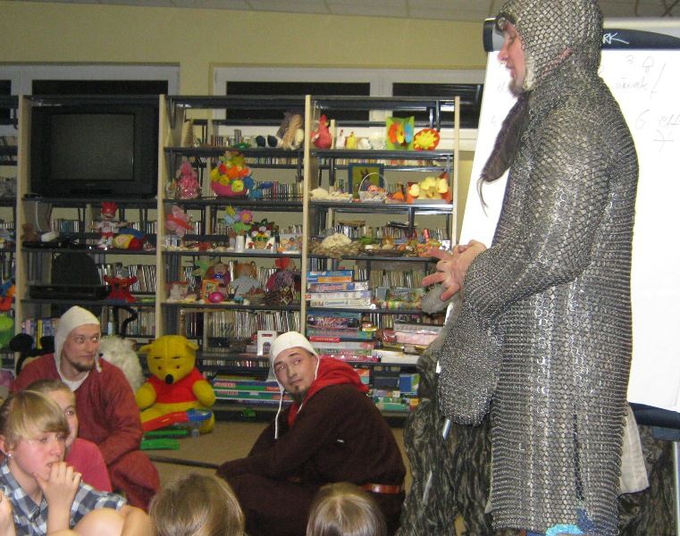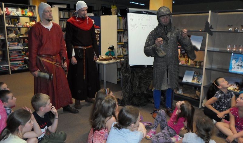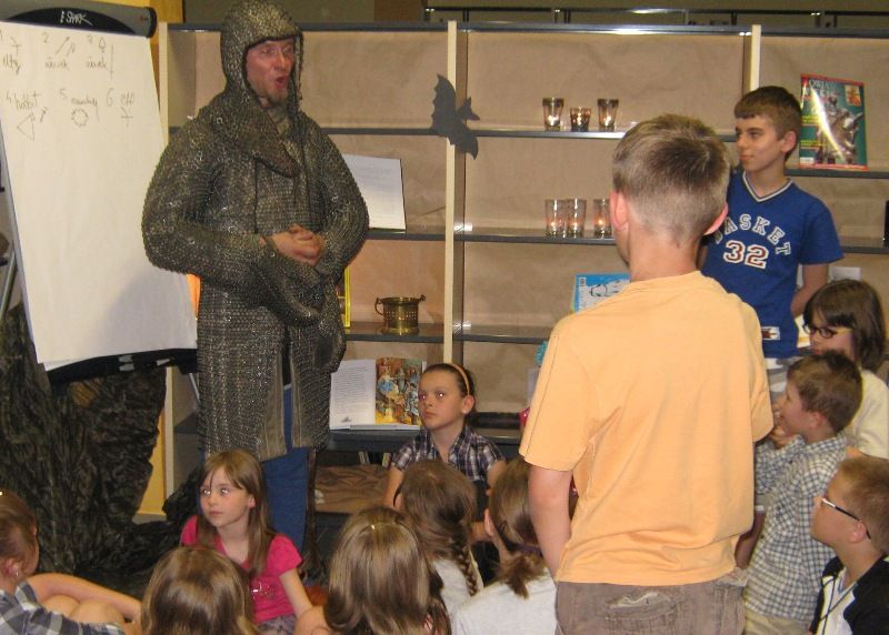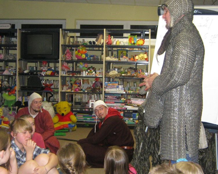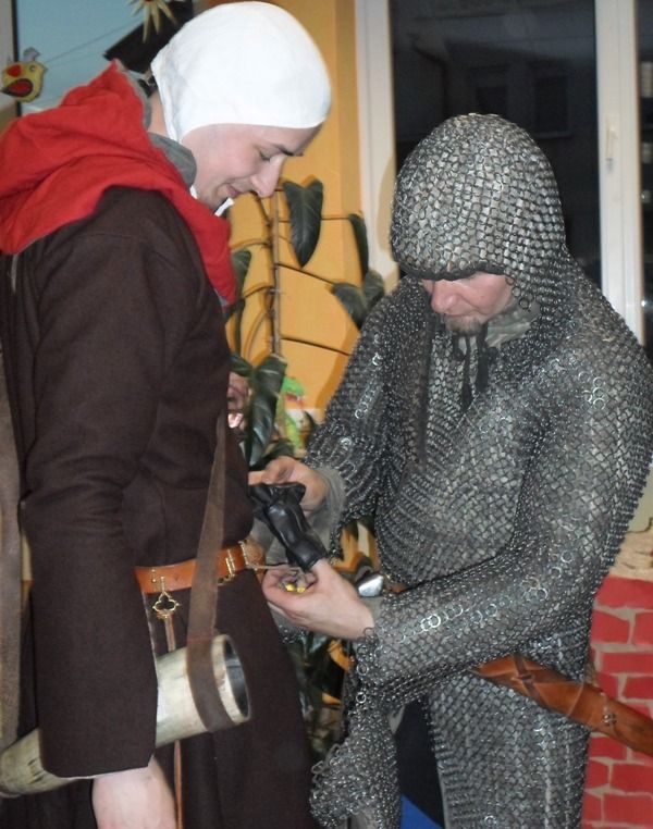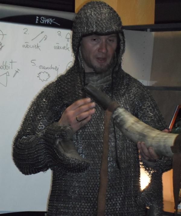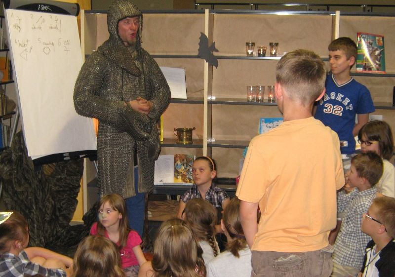 W dobranej scenerii w sposób bardzo fachowy w klimat życia i ubioru rycerstwa z tej epoki wtajemniczył uczestników nocy dowódca bractwa, a także nauczyciel w Publicznej Szkole Podstawowej nr 2 w naszym mieście Sławomir Bator. W czasie historycznej gawędy wielką atrakcją była przymiarka repliki rycerskiego hełmu dowódcy bractwa. W następnej kolejności rycerze przeprowadzili grę fabularną polegającą na złapaniu strasznego smoka.