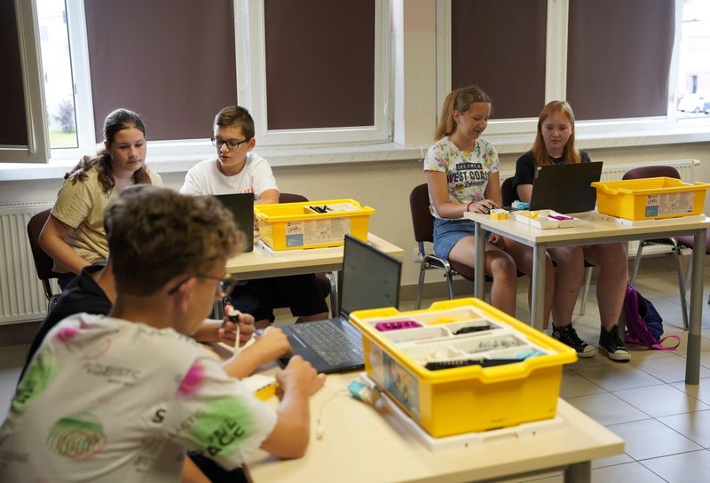 Na początek uczestnicy sprawdzili wszystkie silniki i czujniki w zestawach klocków Lego Education Spike, następnie musieli stworzyć projekt w aplikacji Lego Spike Rower Treningowy Fitness. Konstrukcja była już wstępnie zaprogramowana tak, aby mogła zostać uruchomiona. Młodzież miała za zadanie ulepszyć zarówno sam model, jak i program. Twórczym wyzwaniem okazało się skonstruowanie maszyny jeżdżącej przy użyciu silników i elementów z zestawu klocków. Trzeba było zrobić to w taki sposób, aby mogła szybko nabrać prędkości. Młodzież z dużym zaangażowaniem pracowała w grupach wymieniając się uwagami i spostrzeżeniami. Kiedy drużyny zbudowały i zaprogramowały swoje pojazdy, odbył się wyścig. Zajęcia przyniosły dużą dawkę wiedzy zdobytej poprzez zabawę, dodatkowo urozmaiconą szczyptą zdrowej rywalizacji.