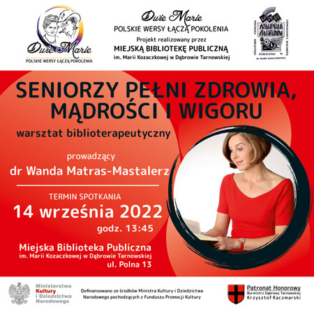 Miejska Biblioteka Publiczna w Dąbrowie Tarnowskiej zaprasza do udziału w warsztacie biblioterapeutycznym pn. „Seniorzy pełni zdrowia, mądrości i wigoru”.