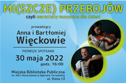 Warsztaty muzyczne pt. „MI(SZCZE) PRZEBOJÓW” prowadzone przez Annę i Bartłomieja Więcków odbędą się w trzech terminach: 30 maja oraz 13 czerwca w godzinach 16:00-18:00, a także 15 czerwca w godzinach 17:00-19:00 (o ewentualnej zmianie terminów zgłoszeni uczestnicy informowani będą bezpośrednio).