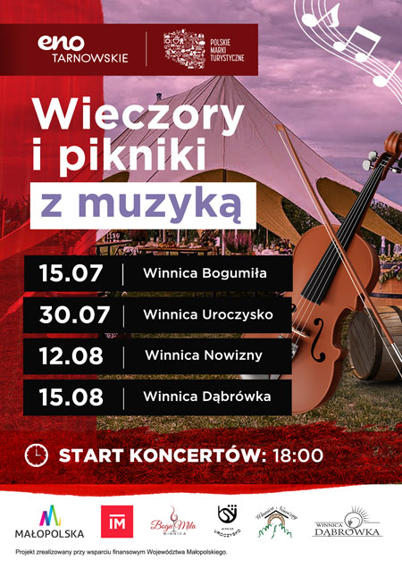 Kolejne wydarzenia cyklu „Wieczory i pikniki z muzyką” zaplanowano: 30 lipca na Winnicy Uroczysko (Janowice, pow. tarnowski), 12 sierpnia na Winnicy Nowizny (Połom Mały koło Iwkowej, pow. brzeski) oraz 15 sierpnia na Winnicy Dąbrówka (Dąbrówka Szczepanowska, pow. tarnowski). Organizatorzy oraz właściciele winnic serdecznie zapraszają do udziału w tych niezwykłych wydarzeniach w malowniczych plenerach (w przypadku deszczu imprezy odbędą się w pomieszczeniach zamkniętych bądź pod namiotem).