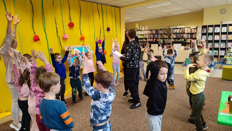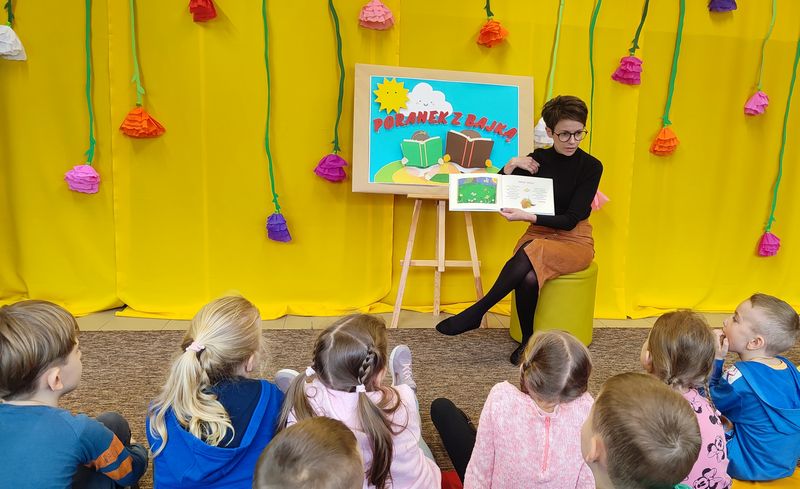 Marcowy „Poranek z Bajką” odbył się w towarzystwie grupy „Trefliki” z Przedszkola nr 1 w Dąbrowie Tarnowskiej i współprowadzących: