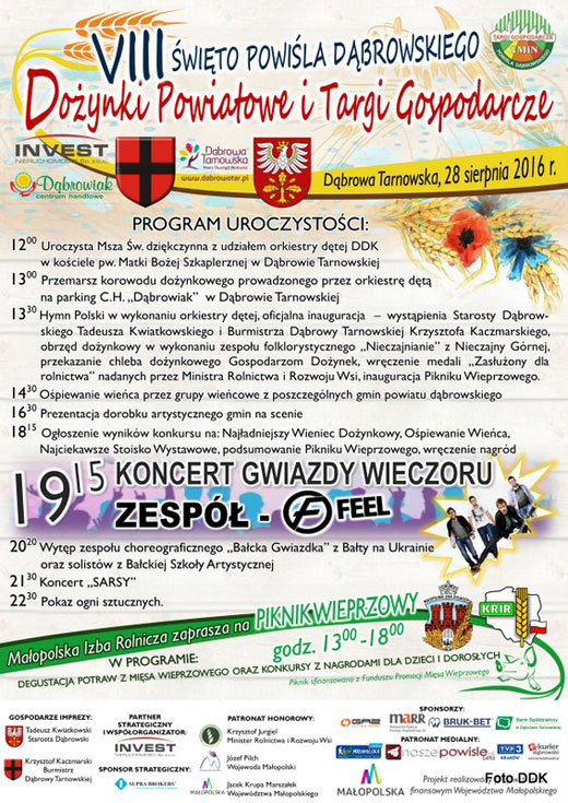 W niedzielę, 28 sierpnia br. na placu przy C.H. „Dąbrowiak” w Dąbrowie Tarnowskiej odbędzie się już po raz ósmy „Święto Powiśla Dąbrowskiego – Dożynki Powiatowe i Targi Gospodarcze”, promujące polskie rolnictwo i przedsiębiorczość (występy na scenie od godz.13:30, msza św. dożynkowa w kościele parafialnym pw. Matki Bożej Szkaplerznej o 11:00, po niej barwny korowód prowadzony ul. Grunwaldzką przez orkiestrę dętą DDK).