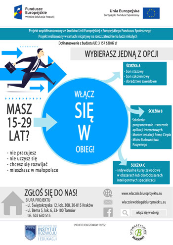Jeśli chcesz podnieść swoje kwalifikacje i odbyć ciekawe szkolenia zawodowe, uzyskać certyfikat potwierdzający nabyte umiejętności, w obszarze Inteligentnych Specjalizacji, lub staż, odwiedź naszą stronę www.wlaczsie.biuroprojektu.eu. Sam zdecyduj co wybierasz! Możesz wybrać jedną ze ścieżek :