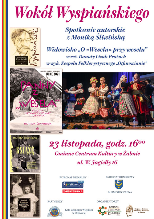 23 listopada o godz. 16:00 w sali widowiskowej GCK w Żabnie przy ul. Władysława Jagiełły 16 odbędzie się spotkanie autorskie z Moniką Śliwińską – autorką m.in. biografii Stanisława Wyspiańskiego, a tuż po nim będzie można obejrzeć widowisko pt. „O „Weselu” przy weselu” w reż. Danuty Lizak-Prażuch w wykonaniu Zespołu Folklorystycznego „Otfinowianie”.