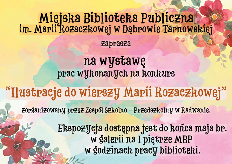 Dzięki udostępnieniu przez tę placówkę prac wykonanych na Powiatowy Konkurs Plastyczny pn. „Ilustracje do wierszy Marii Kozaczkowej” zorganizowano wystawę, którą można oglądać do końca maja br. w galerii na I piętrze MBP w godzinach otwarcia biblioteki.