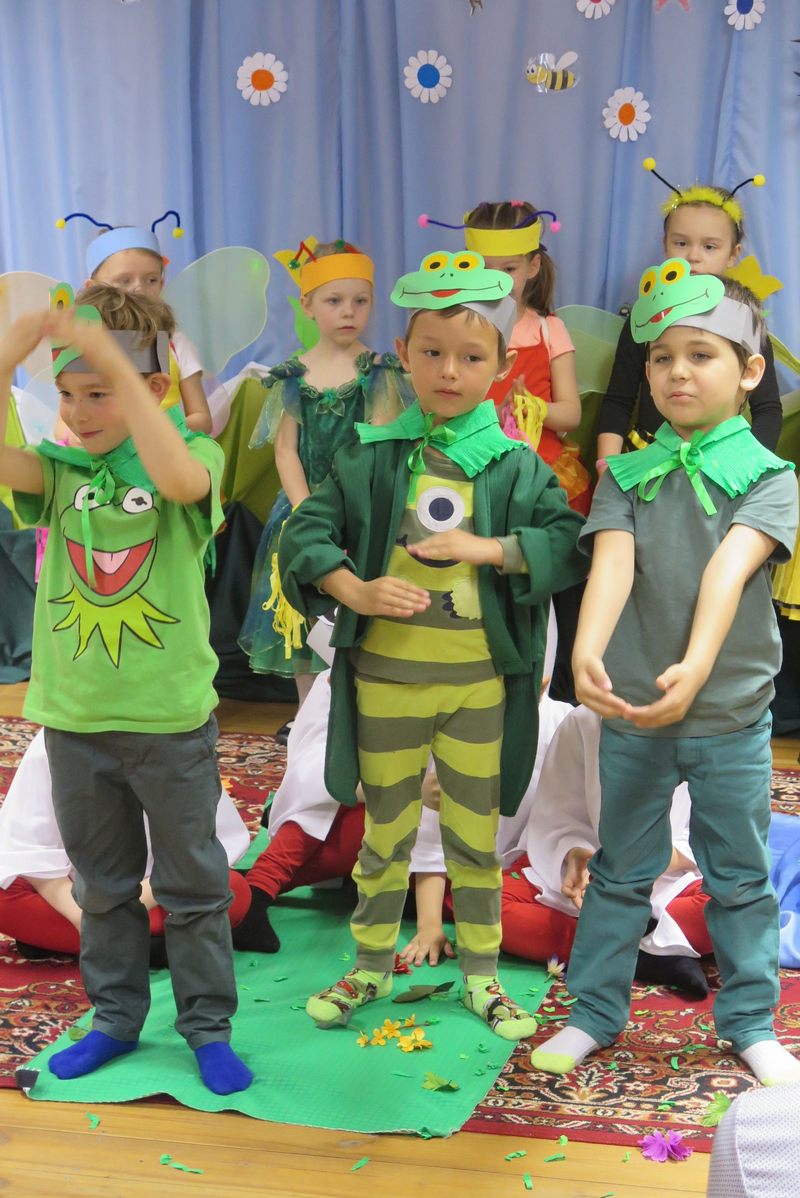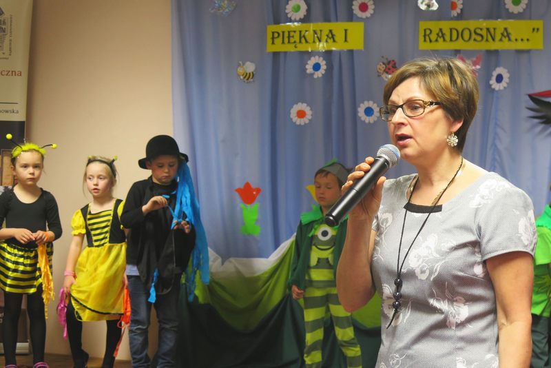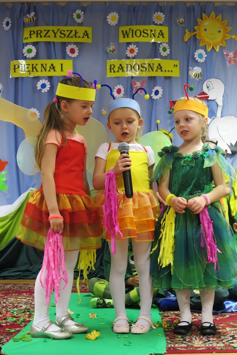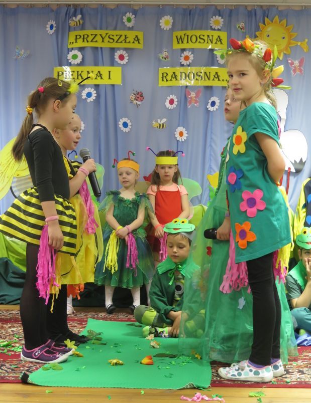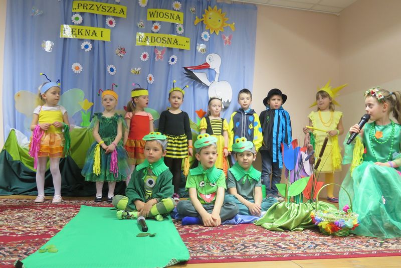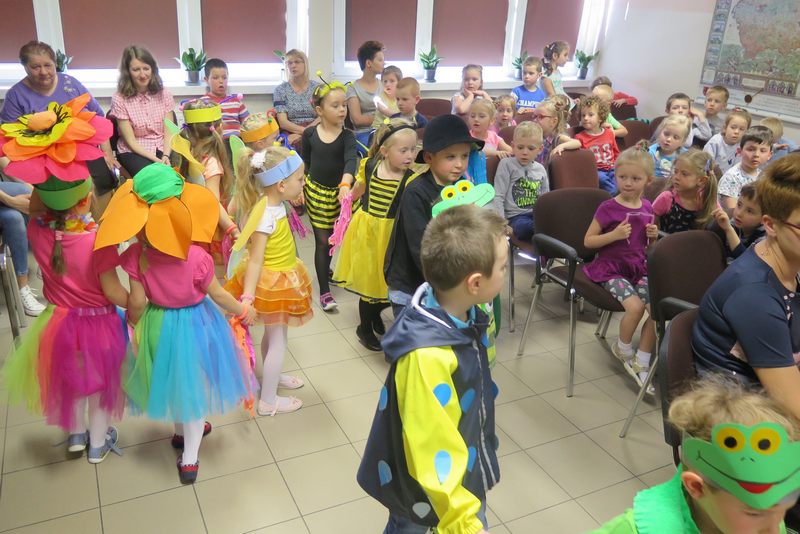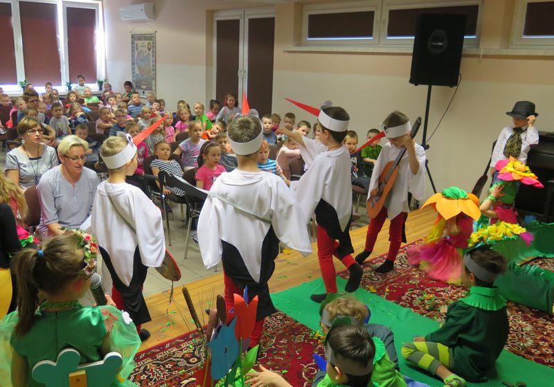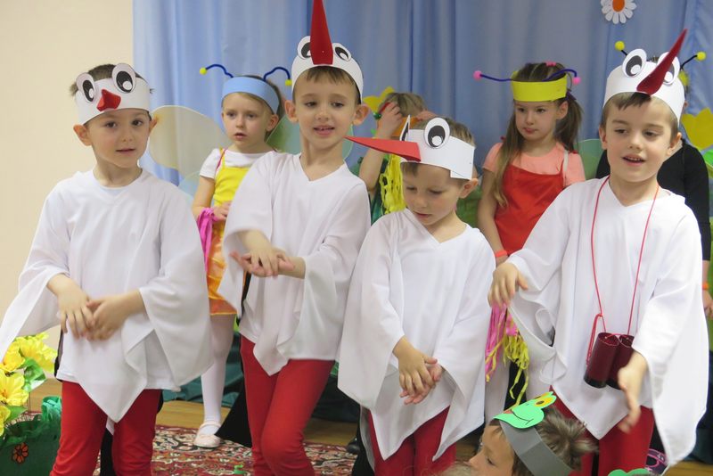Występ słowno-muzyczny nie tylko wciągnął do wesołego nucenia i bujania w rytmach wiosennych melodii wszystkie zebrane dzieci, ale też w towarzystwie biedroneczek, pszczółek, żabek, bocianów i wielu innych postaci „rozkręcił” wiosenne nastroje na dobre…