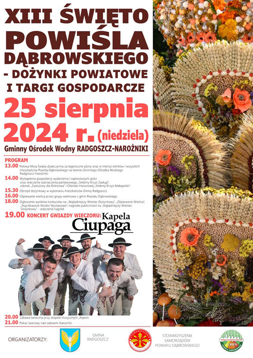 W najbliższą niedzielę 25 sierpnia 2024 r. w Narożnikach w gminie Radgoszcz odbędzie się XIII Święto Powiśla Dąbrowskiego — Dożynki Powiatowe i Targi Gospodarcze.