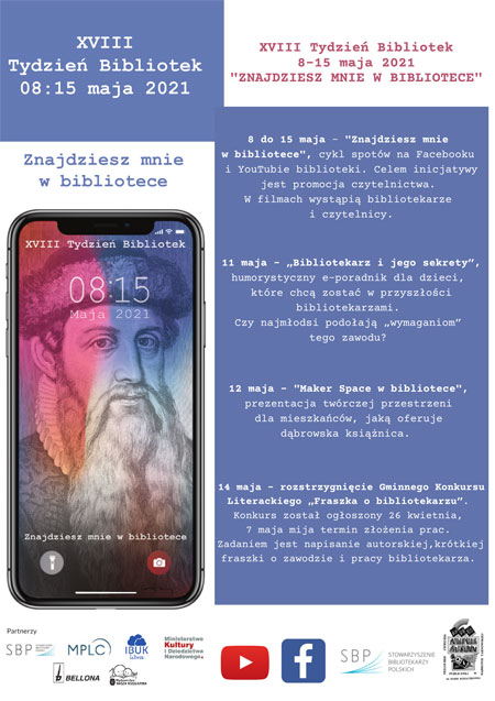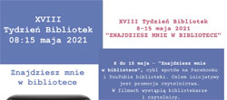 Program obchodów XVIII Tygodnia Bibliotek w Miejskiej Bibliotece Publicznej im.Marii Kozaczkowej w Dąbrowie Tarnowskiej w dniach 08.05-15.05. 2021 r., który w tym roku odbywa się pod hasłem „Znajdziesz mnie w bibliotece”.
