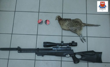 Podczas przeszukania pojazdu policjanci znaleźli broń pneumatyczna z celownikiem optycznym i tłumikiem oraz upolowanego bażanta. Mężczyzna, który przyznał się do nielegalnych połowów bażantów usłyszał zarzuty i za swoje czyny odpowie przed dąbrowskim sądem.