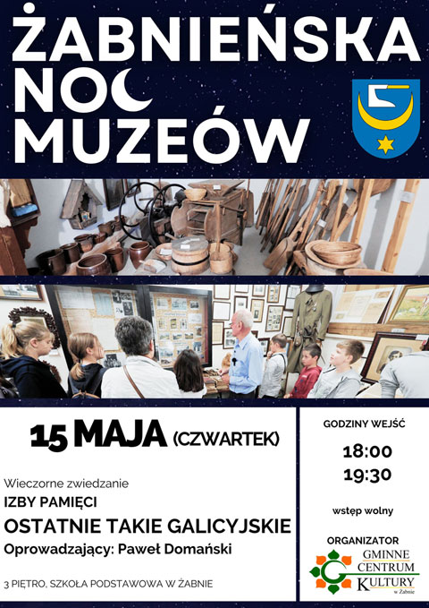 Będzie to wyjątkowa okazja, do odwiedzenia Izby Pamięci „Ostatnie takie galicyjskie”, która znajduje się w Szkole Podstawowej w Żabnie. Wieczorne zwiedzanie odbędzie się w czwartek 15 maja o godz. 18:00 i 19:30.