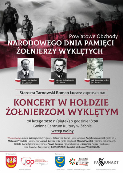 28 lutego o godz. 18:00 w Gminnym Centrum Kultury w Żabnie odbędzie się Koncert w Hołdzie Żołnierzom Wyklętym. Koncert odbędzie się w ramach Powiatowych Obchodów Narodowego Dnia Pamięci Żołnierzy Wyklętych.