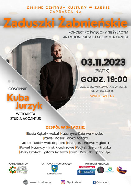 Gminne Centrum Kultury w Żabnie zaprasza na ZADUSZKI ŻABNIEŃSKIE – koncert poświęcony nieżyjącym artystom polskiej sceny muzycznej. Koncert zaduszkowy, organizowany jest w Żabnie od ponad 10 lat.
