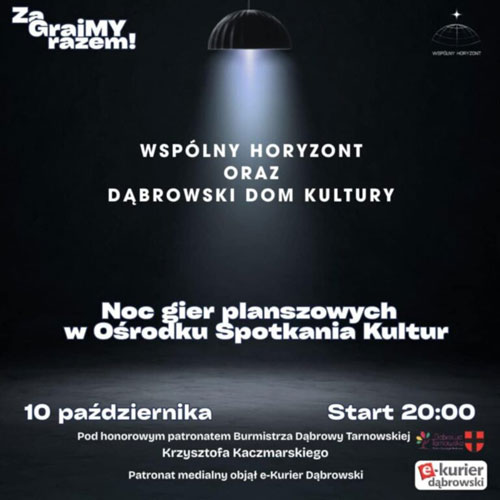 Już w piątek, 10 października, Stowarzyszenie Wspólny Horyzont oraz Dąbrowski Dom Kultury zapraszają do Ośrodka Spotkania Kultur wszystkich miłośników planszówek – i tych początkujących, i doświadczonych graczy – na wyjątkową Noc Gier Planszowych.