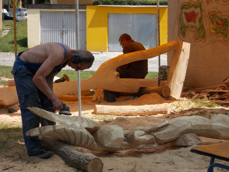 Rzeźbiarze (w tym czterej artyści z Białorusi: Wołodia Czykwin, Mikołaj Sklar, Anatol Turkow i Mikołaj Zadrejka oraz Bogusław Migel ze Sławna w województwie zachodniopomorskim i Marek Romanowski z miejscowości Chodel w województwie lubelskim) rzeźbili w „pracowni” na wolnym powietrzu na placu przed DDK. Tu można nadal oglądać ich prace, m.in. oryginalną ławkę z lwem przygotowaną dla Gimnazjum nr 2, leśnika wyrzeźbionego dla Nadleśnictwa, sokoła unoszącego królika, który zostanie w DDK.