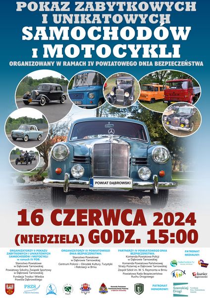 Zapraszamy wszystkich mieszkańców powiatu dąbrowskiego i okolic do udziału w tym wyjątkowym przedsięwzięciu. Pokaz będzie niewątpliwie wspaniałą okazją do obejrzenia pojazdów zabytkowych i unikatowych, wykonania pamiątkowych zdjęć oraz ciekawych rozmów. Nie może Was tu zabraknąć. Do zobaczenia na pokazie!