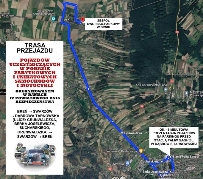 Pojazdy pojawią się również w stolicy powiatu, bowiem uczestnicy pokazu ok. godziny 17:00 wyruszą w kolumnie z Brnia do Dąbrowy Tarnowskiej. Przejazd będzie przebiegał trasą: Breń, Swarzów, Dąbrowa Tarnowska: ul. Grunwaldzka, ul. Berka Joselewicza, ul. Warszawska. Następnie pojazdy zatrzymają się na krótki postój na parkingu obok stacji paliw SASPOL, aby potem wyruszyć w drogę powrotną ul. Sucharskiego, ul. Grunwaldzką, przez Swarzów do Brnia (ok. godz. 18:00).