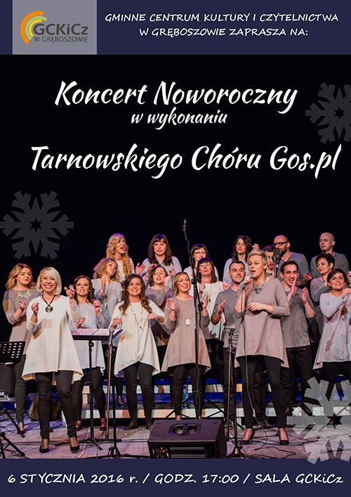 Gminne Centrum Kultury i Czytelnictwa w Gręboszowie zaprasza na Koncert Noworoczny Tarnowskiego Chóru Gos.pl, który odbędzie się 6 stycznia 2016 roku o godz. 17.00 w sali GCKiCz.
