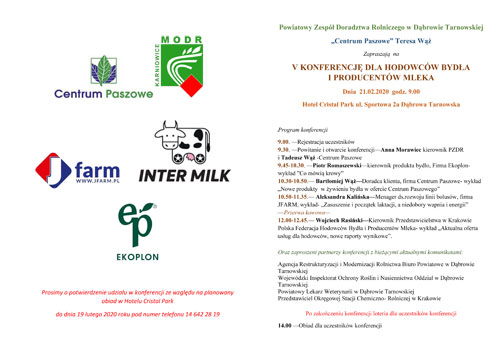 W imieniu Powiatowego Zespołu Doradców Rolniczych MODR w Dąbrowie Tarnowskiej oraz „Centrum Paszowego” – Teresy Wąż, serdecznie zapraszamy do udziału w Konferencji hodowców bydła i producentów mleka, z terenu naszego powiatu i z powiatów sąsiednich.