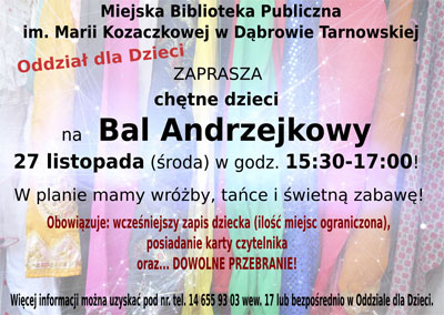 Oddział dla Dzieci Miejskiej Biblioteki Publicznej w Dąbrowie Tarnowskiej zachęca do wzięcia udziału w Balu Andrzejkowym organizowanym dla dzieci będących użytkownikami biblioteki (czyli posiadających kartę czytelnika).