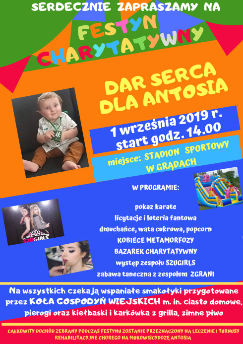 1 września 2019 r. o godzinie 14:00 na stadionie sportowym w Grądach rozpocznie się festyn charytatywny „Dar serca dla Antosia”.