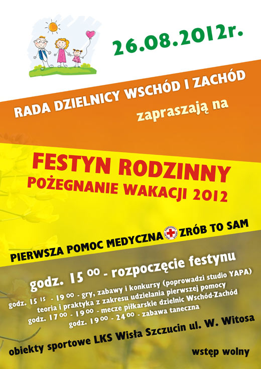 Rada Dzielnicy Wschód i Zachód zapraszają mieszkańców na Festyn Rodzinny Pożegnanie Wakacji 2012 „PIERWSZA POMOC MEDYCZNA – ZRÓB TO SAM”.