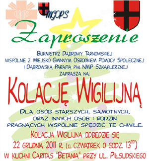 Burmistrz Dąbrowy Tarnowskiej, Miejsko – Gminny Ośrodek Pomocy Społecznej oraz Ks. Proboszcz Parafii pw. NMP Szkaplerznej w Dąbrowie Tarnowskiej, serdecznie zapraszają osoby samotne na wspólną Kolację Wigilijną. Kolacja będzie zorganizowana 22 grudnia (tj. czwartek) o godz. 13:00 w Jadłodajni Betania w Dąbrowie Tarnowskiej przy ul. Piłsudskiego 25.