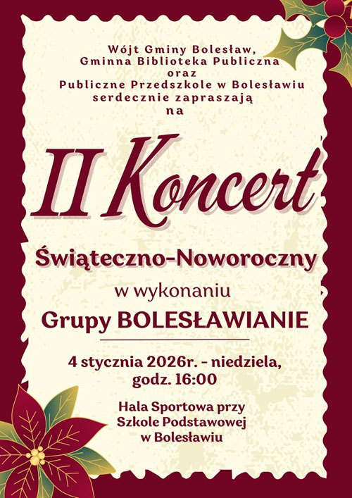 Wójt Gminy Bolesław, Gminna Biblioteka Publiczna w Bolesławiu oraz Publiczne Przedszkole w Bolesławiu serdecznie zapraszają na II Koncert Świąteczno-Noworoczny w wykonaniu Grupy Bolesławianie.