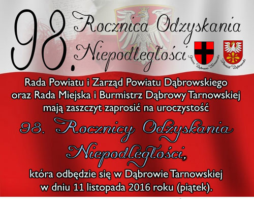 Rada Powiatu i Zarząd Powiatu Dąbrowskiego oraz Rada Miejska i Burmistrz Dąbrowy Tarnowskiej mają zaszczyt zaprosić do udziału w powiatowych obchodach 98. ROCZNICY ODZYSKANIA NIEPODLEGŁOŚCI, które odbędą się w dniu 11 listopada 2016 r. w Kościele NMP Szkaplerznej oraz pod Pomnikiem Poległych w Parku Miejskim w Dąbrowie Tarnowskiej.