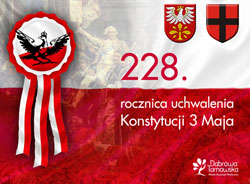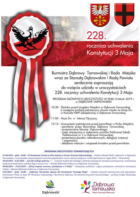 Burmistrz Dąbrowy Tarnowskiej wraz z Radą Miejską oraz Starosta Dąbrowski wraz z Radą Powiatu Dąbrowskiego serdecznie zapraszają wszystkich, a szczególnie Mieszkańców Miasta Dąbrowa Tarnowska, oraz całego Powiatu Dąbrowskiego, jak również miłych Gości do wzięcia udziału w uroczystościach obchodów 228 Rocznicy Uchwalenia Konstytucji 3 Maja.