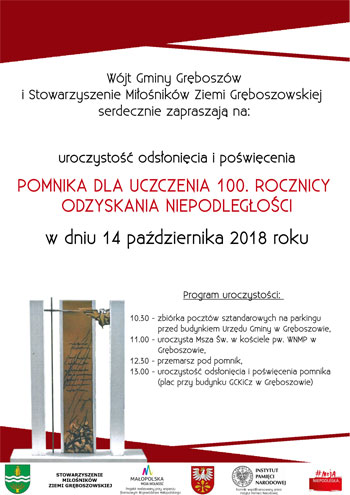Wójt Gminy Gręboszów oraz Stowarzyszenie Miłośników Ziemi Gręboszowskiej serdecznie zapraszają na: uroczystość odsłonięcia i poświęcenia POMNIKA DLA UCZCZENIA 1OO ROCZNICY ODZYSKANIA NIEPODLEGŁOŚCI w dniu 14 października 2018 roku w Gręboszowie.