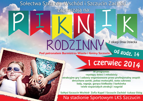 Sołectwa Szczucin Wschód i Szczucin Zachód zapraszają na: PIKNIK RODZINNY z Okazji Dnia Dziecka od godz. 14, 1 czerwca 2014, na stadionie Sportowym LKS Szczucin.