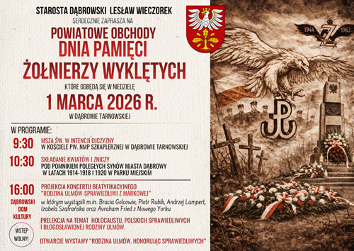 Starosta Dąbrowski Lesław Wieczorek serdecznie zaprasza na Powiatowe Obchody Dnia Pamięci Żołnierzy Wyklętych, które odbędą się w niedzielę 1 marca 2026 r. w Dąbrowie Tarnowskiej.
