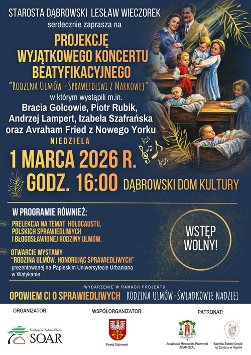 godz. 16:00 Projekcja koncertu beatyfikacyjnego „Rodzina Ulmów – Sprawiedliwi z Markowej” wraz z prelekcją na temat Holocaustu, polskich Sprawiedliwych wśród Narodów Świata oraz błogosławionej Rodziny Ulmów i otwarciem wystawy „Rodzina Ulmów. Honorując Sprawiedliwych” (prezentowanej wcześniej na Papieskim Uniwersytecie Urbaniana w Watykanie) w Dąbrowskim Domu Kultury.